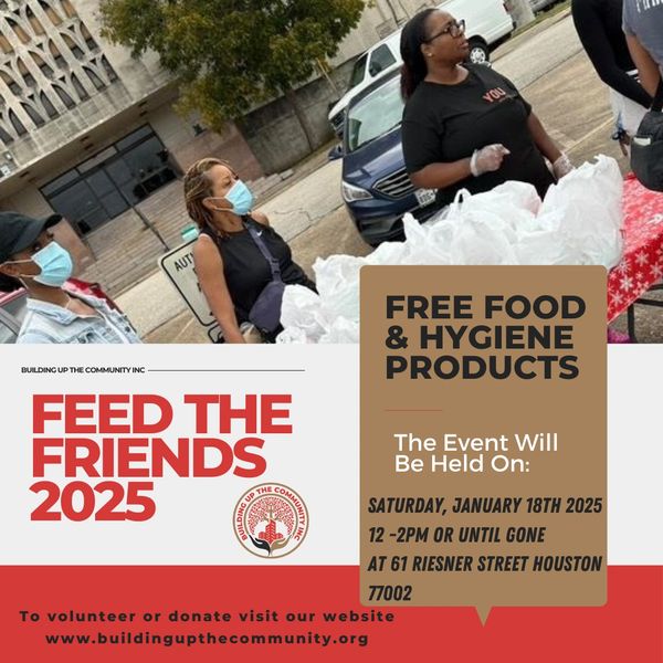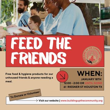 On December 14th we launched our first Feed The Friends event in Houston Texas. It was held outside at 61 Riesner St in front of the municipal court building. We were able to feed and pass out personal hygiene bags to over 60 of our friends.